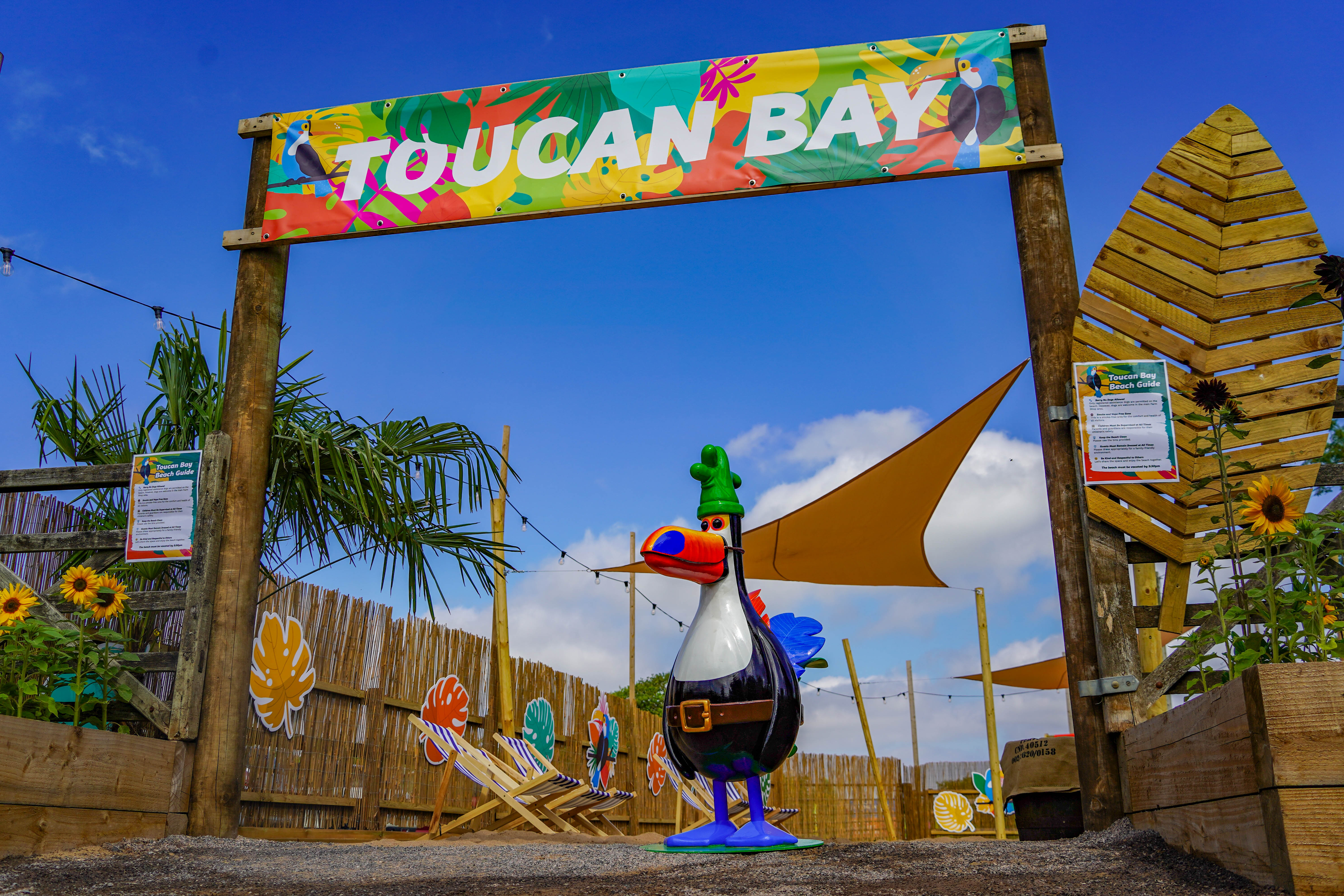 Come and explore Toucan Bay, our new Beach at the Farm Shop. Build sandcastles, enjoy a refreshing drink, and spot Feathers in disguise in his new area...